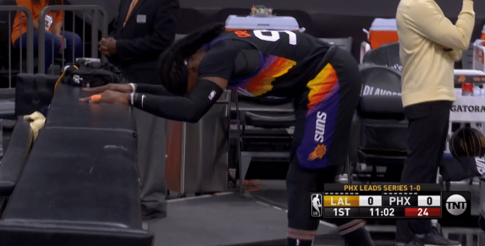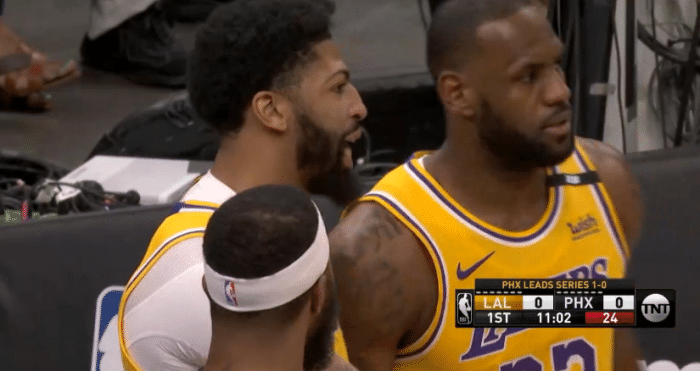 11分02秒,浓眉投篮时踢到克劳德的裆部,随后太阳悍将捂着裆部十分痛苦,痛苦倒地,回到场边依旧痛得拍打桌面,裁判多次回放这一幕,最终吹罚浓眉一级恶意犯规,克劳德也对浓眉犯规,浓眉执行两次罚球;浓眉如此恶犯引热议,现场球迷狂嘘浓眉。