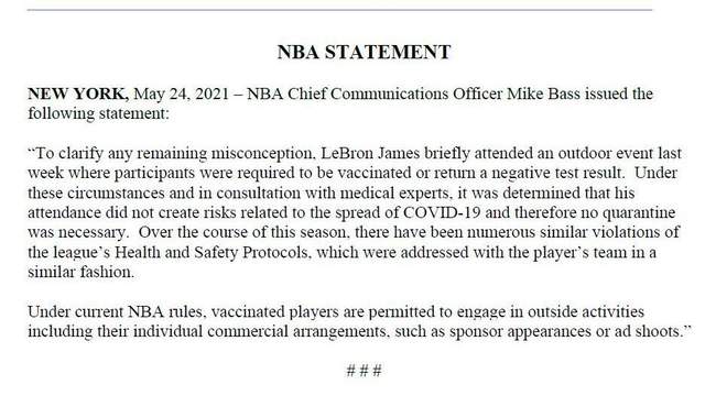 事件回放:湖人勇士的比赛前夕,NBA巨星詹姆斯与德雷克、迈克尔等影视界名流参加了集会,主要为詹旗下的产业——品牌龙舌兰酒进行“商业互吹”活动,不过詹皇却没按规定办事,甚至连口罩都不戴。据悉,老詹的行为明显违反了NBA的健康条例,按规矩应被处罚,甚至存在禁赛的可能。不过据最新消息来说,NBA大佬迈克·巴斯却出来发言,他表示老詹虽违规了,但参与者都接种了疫苗或通过了健康检测,因此詹皇的行为不会对大家的健康安全产生不良影响,故他不用隔离,也不会被禁赛。