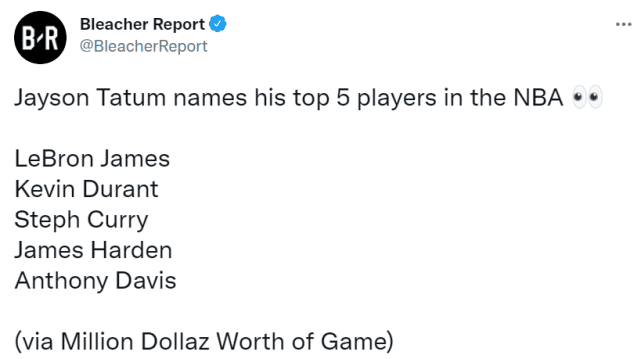 当一个主持人把这个问题抛给塔图姆时,这个年轻人陷入了沉思,看得出来他相当纠结。想了好一阵子后,塔图姆开口说道:“勒布朗(詹姆斯)、KD(杜兰特)……”随后,塔图姆又停下来,想了几秒后继续说道:“斯蒂芬(库里)、詹姆斯(哈登)和AD(浓眉)。”