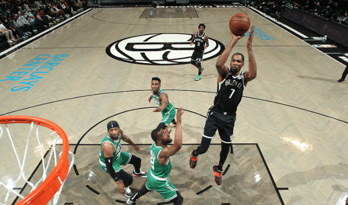 杜兰特首节只有10中2,其中两次的进球都是来自于扣篮,其他禁区外的出手全部投丢。次节逐渐找到手感,到了下半场终于迎来了爆发,他在第三节单节轰下13分,带队反超凯尔特人5分。他在油漆区转身跳投和底角三分球很稳定,同时还在篮下大帽特里斯坦-汤普森,表现很出色。末节杜兰特的反击暴扣相当霸气,也直接一波流带走了比赛,此役杜兰特的发挥是篮网逆转的关键,确实也是这支巨星云集球队的核心。