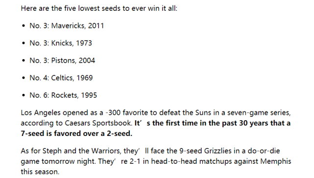 另据美媒报道,在晋级赔率方面,湖人更被看好,这也是过去30年来,第一次出现7号种子比2号种子更被看好。历史上,成功夺冠的最低位次球队是1995年的火箭,当时他们是西部的6号种子,这也意味着如果湖人今年能卫冕成功,他们将创造新的历史:以7号种子的身份夺冠。