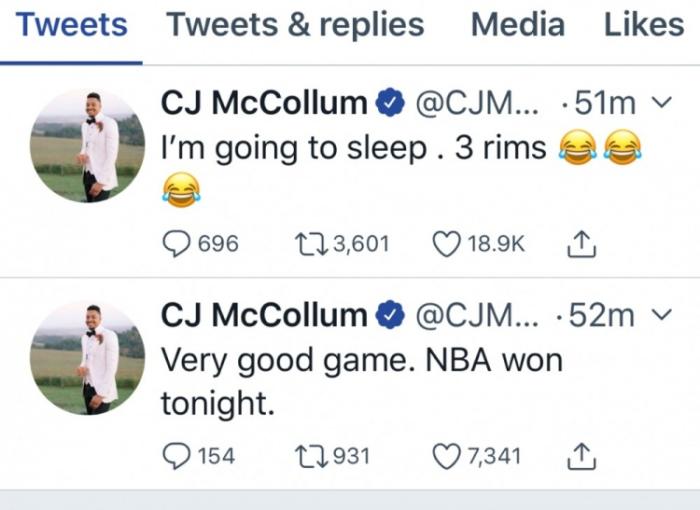 在这一幕发现后,CJ麦科勒姆第一时间站出来嘲讽詹姆斯是年度最好演员,他之所以表现出如此的痛苦,只不过他想多休息几分钟。CJ麦科勒姆的言论引发了不少争议,可是这哥们继续火上浇油,他在社交媒体上写道:今晚是NBA赢了,我去睡觉了三个篮筐,显然CJ麦科勒姆的言论是在嘲讽詹姆斯采访中谈到眼睛被戳伤后,看到三个篮筐,于是他选择中间的言论。
