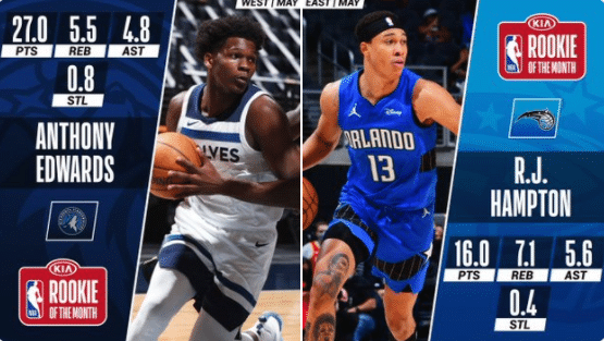 在五月份,​爱德华兹场均27.0分5.5篮板4.8助攻,汉普顿五月份场均16.0分7.1篮板5.6助攻,当选各自分区的月最佳新秀;开拓者主帅斯托茨(7胜2负)和尼克斯主帅锡伯杜(6胜3负)当选五月月最佳教练。