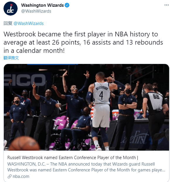 奇才官方第一时间恭喜韦少获得东部月最佳,韦少单月场均26+16+13成为NBA历史首位拿到如此场均三双的球员;本赛季韦少场均22.2分11.5篮板11.7助攻,生涯第四次单赛季场均三双,184次三双继续刷新历史三双纪录(历史第一)。