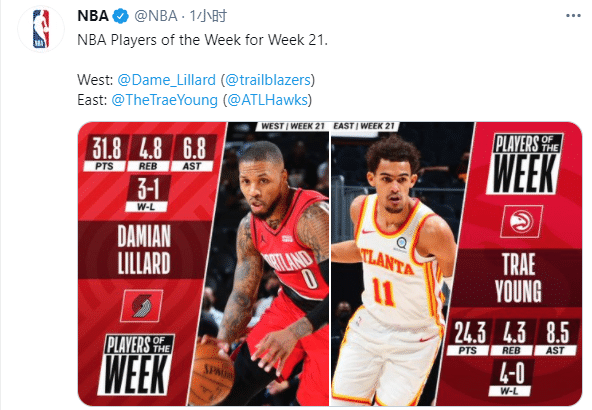 NBA常规赛第21周东西部周最佳球员,上周利拉德场均31.8分6.8助攻4.8篮板,命中率高达57.9%,带领开拓者取得3胜1负并成功直通季后赛;特上周雷-杨场均24.3分8.5助攻4.3篮板,帮助老鹰上周四战全胜并成功锁定一个季后赛席位。