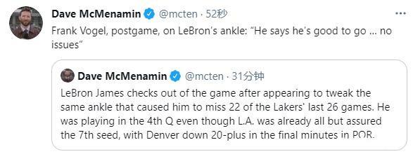詹姆斯的脚踝究竟如何?赛后这个问题也引发了很多球迷的关注,所幸的是湖人这边很快也给出了答案。著名篮球记者DAVE报道,他从湖人队主教练沃格尔那边得到的消息,沃格尔透露詹姆斯的脚踝并没有大碍,詹姆斯本人表示没有什么大问题。
