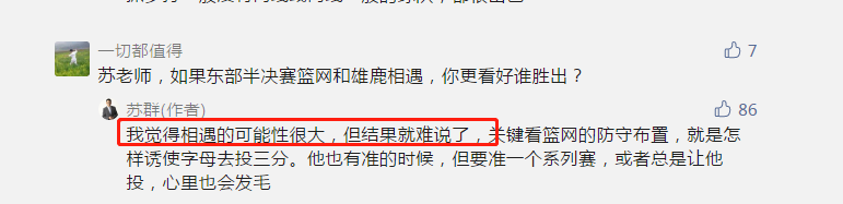 不过,苏群老师也直言,篮网打雄鹿未必就一定能赢,这轮系列赛不好说。网友提问,“苏老师,如果东部半决赛篮网和雄鹿相遇,你看好谁胜出”。