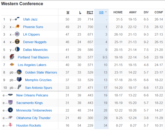 西部前10名确定,马刺虽然输球,但国王也输给灰熊,马刺排名第10位,灰熊的战绩追平勇士,两队将在最后一轮相遇,两队的直接争夺,决定第8名的归属。前6的争夺战,开拓者对阵太阳,本场比赛两队打得都很出色,利拉德和迈克勒姆在前两节发挥出色,保罗带队在第三节拉开分差,太阳一度领先10分。末节比赛利拉德发威,他带队追到107平。