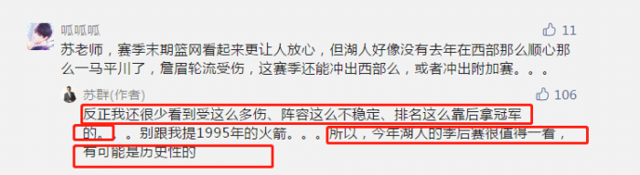 苏群给球迷的评论留言,“我很少看到受这么多伤,阵容这么不稳定,排名这么靠后拿冠军。别和我说1995年的火箭。所以,湖人的季后赛很值得看,有可能会成为历史性的(赛季)”。