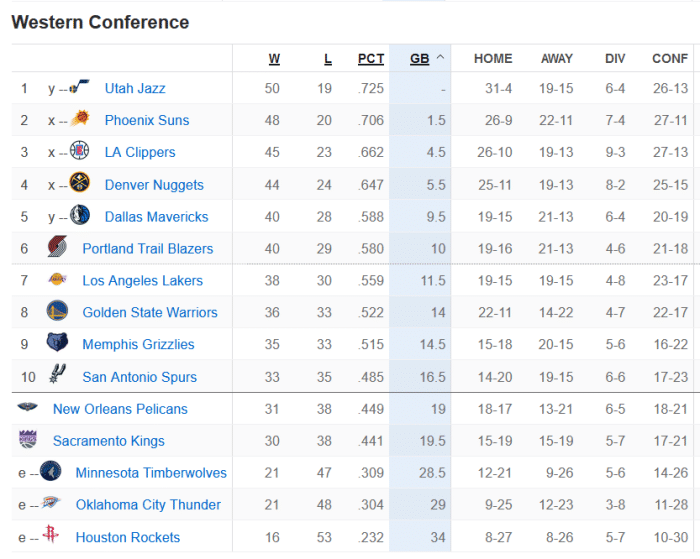 24直播网讯 北京时间5月11日,NBA常规赛结束多场争夺,西部季后赛争夺战有了新的局面。勇士爆冷击败爵士,守住第8的位置,灰熊马刺赢球,鹈鹕争夺附加赛资格希望渺茫。开拓者击败火箭,取得4连胜,他们再次拉开和湖人的差距,不过未来他们面临3场硬仗,湖人依然有机会追赶。