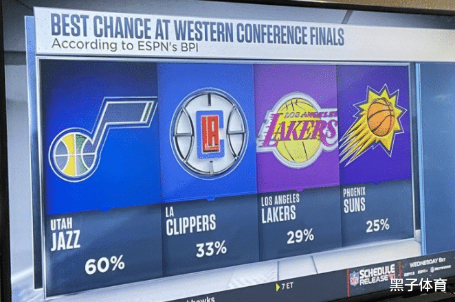 很多人都认同排名西部第七的湖人能够冲击总冠军。美媒ESPN预测进入西部决赛的概率前四名球队,他们分别是:爵士(60%)、快船(33%)、湖人(29%)、太阳(25%)。但几乎没人看好很有可能要和湖人在附加赛相见的勇士。