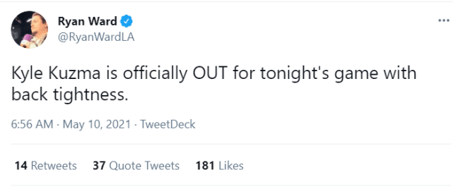 官宣!库兹马因腰部肌肉紧张缺战太阳,他不能打湖人12胜18负