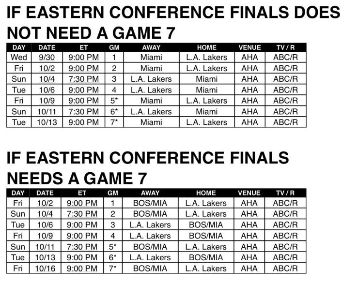 若热火和凯尔特人之间的东部决赛不进行到第七场,则总决赛首场会在北京时间10月1日9:00开启,后续比赛将会分别在北京时间10月3日9:00、10月5日7:30、10月7日9:00、10月10日9:00、10月12日7:30、10月14日9:00进行(后三场如有必要)。