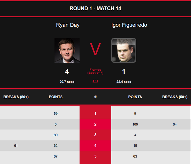首局比赛中,戴通过多次上手,以59-9先胜一局。第二局,菲格雷多打出单杆64分,以109(64)-0零封对手扳平局分。不过此后三局,瑞恩-戴没再给对手机会,分别以80-4、62(61)-15和67-63连胜三局,大比分4-1晋级资格赛第二轮。