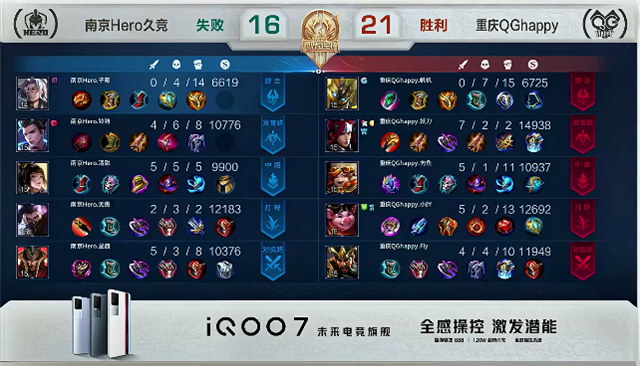 双方和平开局。2分18秒澜拿下暴君,诸葛亮拿下主宰。2分27秒南京Hero久竞入侵野区,西施拿下一血。4分50秒野区团战团战,双方1换1。5分钟后羿推掉下路一塔。65分20秒中路团战,重庆QGhappy打出0换2。6分40秒中路团战,重庆QGhappy打出2换4。7分30秒河道团战,重庆QGhappy打出2换3。7分50秒诸葛亮拿下主宰。8分钟曹操推掉上路一塔。8分36秒太乙真人被击杀。10分钟野区团战,南京Hero久竞打出0换2。10分36秒澜拿下暴君。11分20秒澜拿下主宰。11分34秒后羿推掉上路二塔。12分12秒曹操推掉上路高地塔。12分30秒南京Hero久竞推掉下路高地塔,诸葛亮被击杀。12分45秒后羿推掉中路高地塔。13分10秒钟无艳被击杀。14分钟曹操被击杀。15分10秒澜拿下暴君。15分40秒野区团战,南京Hero久竞打出0换2。16分20秒澜拿下主宰。16分43秒高地团战,重庆QGhappy打出2换3。18分10秒上路团战,南京Hero久竞团灭重庆QGhappy。18分39秒南京Hero久竞推掉水晶拿下本场比赛胜利。