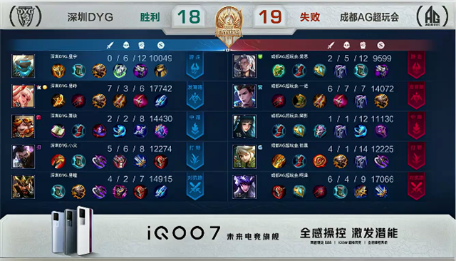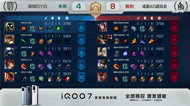 开局中路团战,扁鹊拿下一血。1分40秒太乙真人被击杀。2分钟马可波罗推掉下路一塔。2分24秒云缨拿下暴君。2分40秒赵云拿下主宰。5分10秒马可波罗推掉上路一塔。6分10秒中路团战,深圳DYG打出0换2。8分16秒中路团战,成都AG超玩会团灭深圳DYG,马可波罗拿下四杀。8分47秒成都AG超玩会推掉水晶拿下本场比赛胜利。