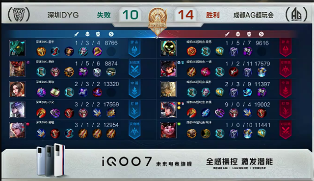 开局深圳DYG3Buff开局。1分45秒深圳DYG强攻上路一塔,镜拿下一血。2分37秒镜拿下主宰。2分48秒深圳DYG入侵野区,不知火舞被击杀。2分50秒娜可露露拿下暴君。3分20秒成都AG超玩会上路一塔被破。4分10秒深圳DYG入侵野区,双方1换1。6分03秒太乙真人被击杀。6分27秒镜拿下暴君。6分50秒李元芳推掉上路一塔。7分10秒野区团战,墨子被击杀。8分钟野区团战,成都AG超玩会打出1换2。10分10秒野区团战,李元芳被击杀。10分47秒镜拿下暴君。11分钟镜推掉下路一塔。12分16秒主宰团,娜可露露拿下主宰,太乙真人被击杀。13分11秒廉颇被击杀。13分45秒河道团战,墨子被击杀,李元芳推掉中路一塔。14分27秒李元芳推掉上路二塔。15分20秒河道团战,成都AG超玩会打出0换2。16分钟李元芳推掉下路高地塔。16分20秒娜可露露拿下暴君。17分钟娜可露露拿下主宰。19分10秒中路团战,深圳DYG打出1换2。21分46秒深圳DYG上路高地塔被破。22分20秒娜可露露拿下风暴龙王,团战成都AG超玩会打出0换1。23分03秒成都AG超玩会推掉水晶率先拿下一分。