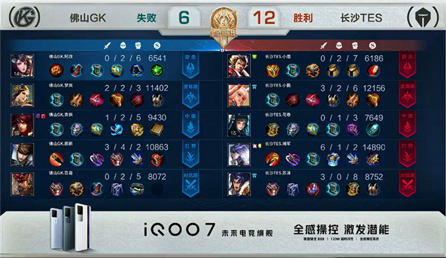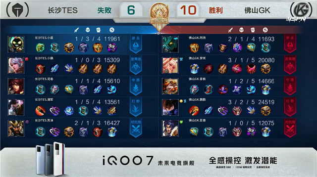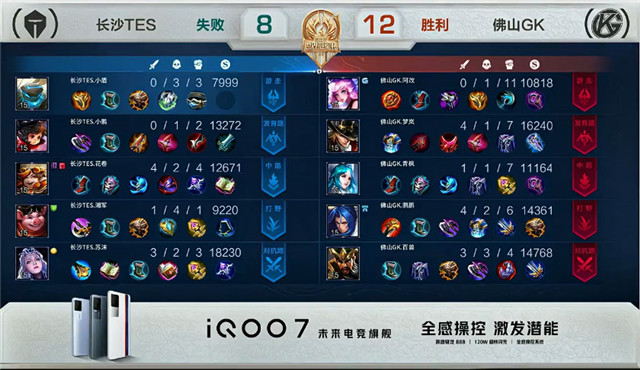 开局佛山GK入侵敌方野区反掉蓝BUFF。1分28秒长沙TES拿下中路河道之灵。2分20秒长沙TES拿下暴君。3分04秒佛山GK下路击杀沈梦溪拿到一血。4分37秒长沙TES野区击杀橘右京。8分11秒野区团战长沙TES打出0换2。8分37秒中路团战长沙TES打出0换3并摧毁敌方中路外塔。14分23秒长沙TES摧毁敌方中路二塔。16分18秒长沙TES上路击杀关羽。18分57秒长沙TES拿下暗影主宰。18分29秒野区团战佛山GK打出0换2。19分20秒佛山GK摧毁敌方中路外塔。21分02秒佛山GK抢下风暴龙王并在团战中打出0换2。21分43秒佛山GK摧毁敌方上路高地塔。21分53秒佛山GK打出1换3。22分08秒佛山GK摧毁敌方水晶拿下比赛。
