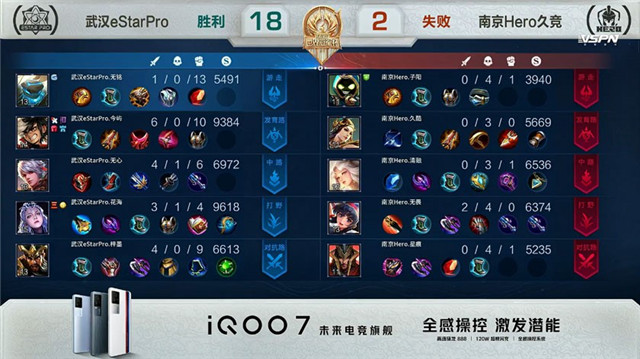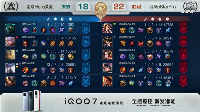 开局武汉ES选择蒙犽中路抢线。43秒武汉ES下路武汉ES下路击杀太乙真人拿到一血。1分01秒武汉ES中路击杀嫦娥并拿下中路河道之灵。2分17秒武汉ES拿下暴君。2分34秒武汉ES上路打出0换2。3分04秒武汉ES摧毁地方上路外塔。5分06秒武汉ES下路打出0换2并摧毁敌方下路外塔。6分08秒上路团战武汉ES打出0换3。6分35秒武汉ES上路击杀蒙恬。6分57秒武汉ES野区击杀娜可露露。7分24秒武汉ES摧毁敌方中路二塔。8分29秒武汉ES摧毁敌方上路高地塔。9分29秒南京Hero中路击杀百里守约。10分18秒野区团战武汉ES打出0换5,露娜拿到三连决胜。10分45秒武汉ES摧毁敌方水晶拿下比赛。