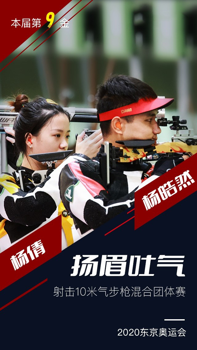 北京时间7月27日消息,东京奥运会射击比赛继续进行,中国队又夺一金。杨倩/杨皓然在气步枪混团决赛里以17比13战胜美国对手夺冠,这是中国代表团在本届奥运会的第9金。