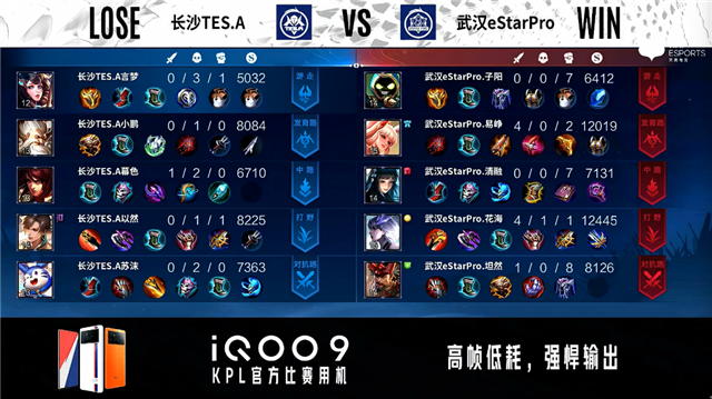 双方常规开局。2分42秒野区团战长沙TES.A打出1换3。6分13秒中路团战双方3换3。7分16秒中路团战双方1换1。8分05秒长沙TES.A拿下暴君。10分24秒主宰处团战武汉eStar打出1换3。11分05秒武汉eStar摧毁敌方中路外塔。12分26秒双方边路二塔互换。13分06秒武汉eStar拿下暗影暴君。13分50秒中路团战武汉eStar击杀镜。14分08秒长沙TES.A高地击杀李元芳。14分29秒高地团战武汉eStar打出0换2。14分49秒武汉eStar对抗路击杀镜。15分05秒武汉eStar摧毁敌方对抗路高地塔。15分16秒武汉eStar摧毁敌方中路高地塔。16分整武汉eStar野区击杀鲁班大师。16分23秒武汉eStar摧毁敌方水晶拿下比赛。