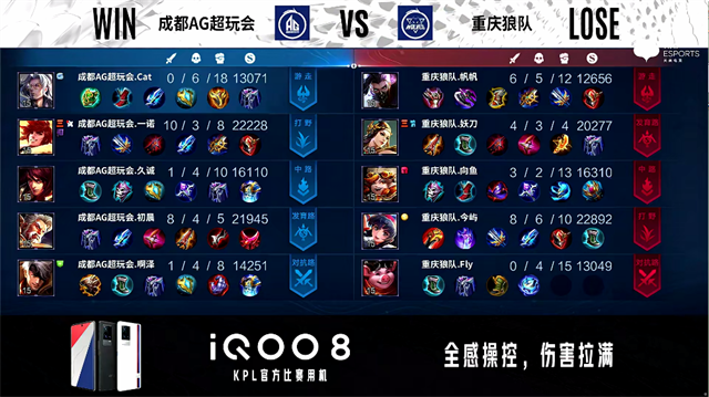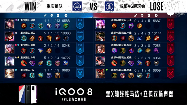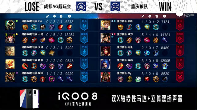 2分30秒,重庆狼队控下暴君。3分31秒,成都AG马可波罗下路击杀大乔拿下一血。5分34秒,重庆狼队上路打出0换2并破掉成都AG上一塔,镜拿下双杀。6分24秒,重庆狼队镜下路击杀娜可露露。6分41秒,重庆狼队破掉成都AG中一塔。7分05秒,重庆狼队控下暴君。8分22秒,双方团战3换3。8分57秒,成都AG破掉重庆狼队上一塔。10分12秒,双方2换2。10分52秒,重庆狼队控下暗影暴君。13分07秒,双方团,重庆狼队打出0换2。13分31秒,重庆狼队破掉成都AG中二塔。13分44秒,重庆狼队破掉成都AG上高地。14分10秒,重庆狼队赢下高地团,一波摧毁成都AG水晶拿下最终胜利!