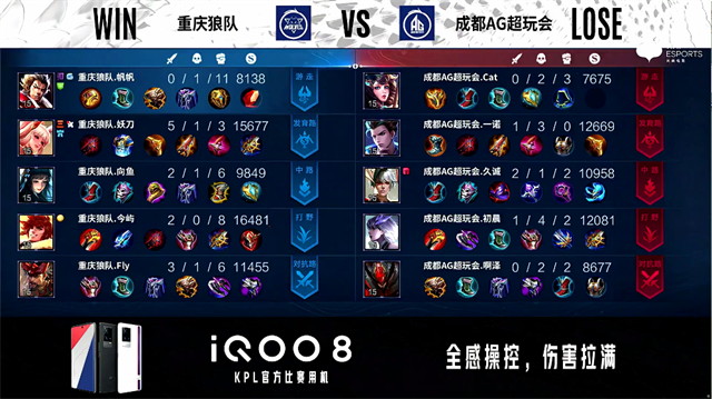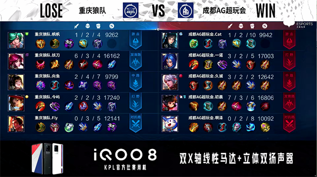 2分24秒,成都AG控下先知主宰。5分22秒,野区团,双方1换1。6分05秒,成都AG破掉重庆狼队上一塔。6分37秒,中路团,重庆狼队打出0换3,随后控下暴君。7分10秒,重庆狼队破掉成都AG中一塔。7分20秒,重庆狼队击杀白起。8分55秒,下路团,重庆狼队打出0换2并破掉成都AG下二塔。9分26秒,重庆狼队破掉成都AG中二塔。10分21秒,重庆狼队控下暗影暴君。12分09秒,重庆狼队控下暗影主宰。13分36秒,成都AG反打打出0换2。14分42秒,重庆狼队控下暗影暴君。15分50秒,重庆狼队破掉成都AG下高地,成都AG击杀脱节的廉颇。16分42秒,双方团,重庆狼队打出0换2。17分15秒,重庆狼队破掉成都AG中、上高地。17分47秒,重庆狼队控下暗影主宰。19分07秒,重庆狼队公孙离拿下三杀后破掉成都AG水晶先下一城。