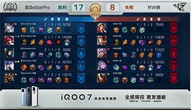 双方常规开局。55秒武汉ES入侵野区反掉红BUFF。1分53秒武汉ES关羽对抗路单杀露娜拿到一血。2分05秒武汉ES野区击杀夏侯惇。2分57秒武汉ES对抗路击杀夏侯惇。5分08秒武汉ES摧毁敌方发育路外塔。5分42秒武汉ES对抗路击杀露娜。5分59秒武汉ES中路击杀百里守约。6分27秒对抗路团战RW侠打出1换4,露娜拿到三连决胜。7分09秒双方中路1换1。8分18秒武汉ES拿下主宰。8分42秒武汉ES中路击杀张飞。9分35秒武汉ES拿下暗影暴君。10分18秒武汉ES拿下暗影主宰,RW侠拿下暗影暴君。11分03秒武汉ES摧毁敌方中路外塔。11分21秒野区团战武汉ES打出0换3。11分51秒武汉ES摧毁敌方对抗路高地塔。14分43秒RW侠抢到暗影主宰。15分10秒武汉ES中路击杀夏侯惇。15分22秒武汉ES拿下暗影暴君。15分56秒发育路双方游走互换。16分27秒RW侠对抗路击杀关羽。17分09秒RW侠摧毁敌方中路外塔。18分23秒双方高地下1换1。18分59秒RW侠拿下暗影主宰。20分28秒中路团战武汉ES打出0换3。21分05秒武汉ES摧毁敌方水晶拿下比赛。