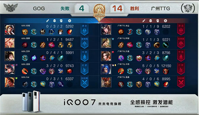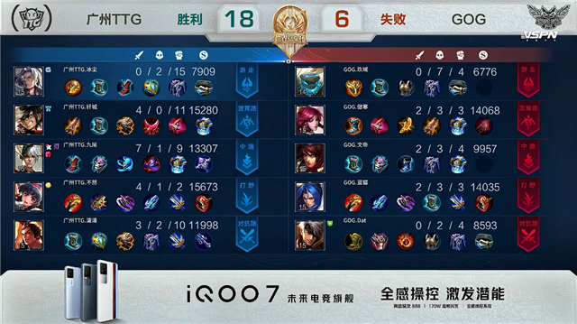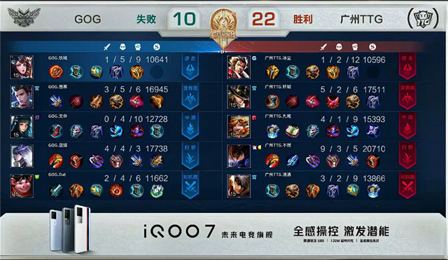 双方常规开局。1分22秒广州TTG对抗路击杀猪八戒拿到一血。1分58秒双方发育路1换1。2分34秒GOG抢到暴君,后续团战广州TTG击杀镜。3分31秒GOG摧毁敌方发育路外塔。4分整广州TTG对抗路击杀猪八戒。5分12秒对抗路团战广州TTG打出1换2。6分14秒广州TTG对抗路打出0换2。6分29秒GOG摧毁敌方发育路二塔。7分整广州TTG拿下暴君。7分43秒广州TTG野区击杀西施。8分33秒广州TTG对抗路打出0换2。9分13秒广州TTG拿下主宰。9分22秒GOG中路击杀夏侯惇。9分48秒双方野区打野互换。9分57秒广州TTG摧毁敌方中路外塔。10分36秒GOG拿下暗影主宰。10分45秒广州TTG拿下暗影暴君。11分23秒广州TTG发育路击杀大乔。13分49秒广州TTG对抗路击杀狄仁杰。14分27秒GOG高地下击杀夏侯惇。14分59秒GOG拿下暗影主宰。15分10秒广州TTG拿下暗影暴君。15分40秒广州TTG对抗路击杀狄仁杰。17分09秒GOG中路击杀张飞。17分45秒中路团战GOG击杀澜。19分30秒广州TTG拿下暗影暴君。20分21秒中路团战广州TTG打出1换3。21分28秒广州TTG拿下风暴龙王。22分14秒广州TTG摧毁敌方中路、发育路高地塔。23分26秒广州TTG摧毁敌方对抗路高地塔。24分35秒广州TTG对抗路击杀镜。25分08秒广州TTG摧毁敌方水晶拿下比赛。