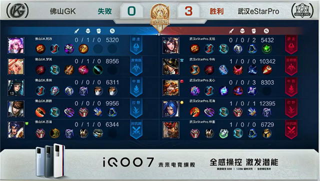 开局武汉ES蒙犽中路抢线。1分整佛山GK反掉敌方蓝BUFF。2分04秒对抗路团战武汉ES打出0换3。3分55秒双方中路1换1。4分46秒武汉ES拿下暴君。6分37秒野区团战佛山GK打出1换2。7分20秒野区团战佛山GK打出1换5。9分17秒佛山GK拿下暴君。9分46秒佛山GK野区击杀孙膑。10分18秒佛山GK暴君处击杀张良。11分34秒佛山GK摧毁敌方对抗路二塔。11分53秒佛山GK拿下暗影主宰。12分11秒佛山GK野区打出1换5。12分40秒佛山GK摧毁敌方水晶拿下比赛。