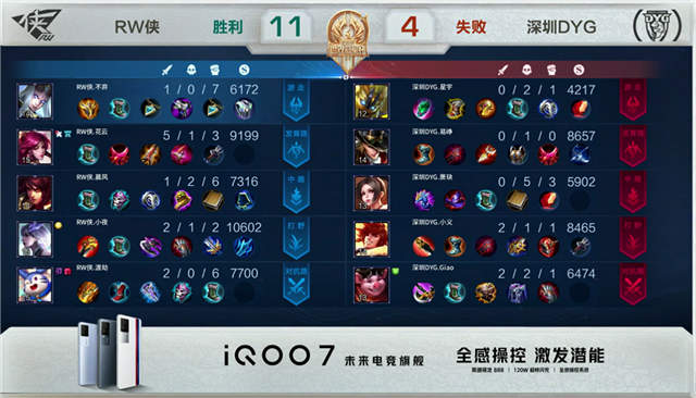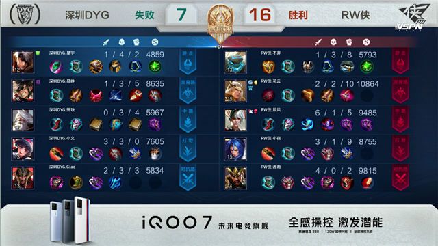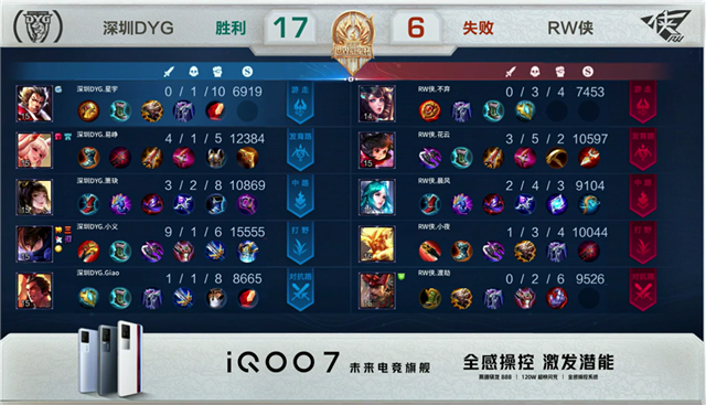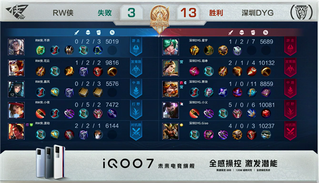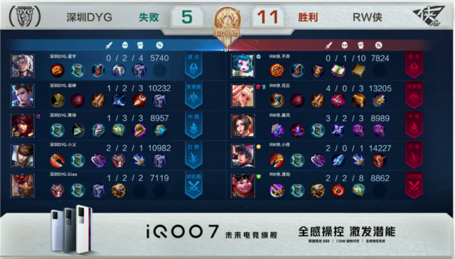 2分13秒,RW侠拿下暴君,随后深圳DYG沈梦溪击杀云缨拿下一血。5分01秒,RW侠吕布击杀庄周。5分28秒,RW侠鲁班七号击杀虞姬。5分58秒,上路团,深圳DYG打出0换3。9分35秒,双方团,深圳DYG打出1换3。10分36秒,深圳DYG拿下暗影主宰。11分21秒,深圳DYG破掉RW侠上二塔。12分27秒,深圳DYG拿下暗影暴君。13分40秒,上路团,深圳DYG打出0换5团灭对手并破掉RW侠上高地。14分06秒,兵线到达后,深圳DYG摧毁RW侠水晶拿到赛点。
