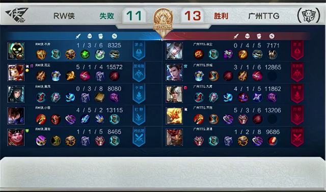 镜拿下一分钟中路河道之灵。1分50秒老夫子拿下一血。2分18秒沈梦溪被击杀。2分29秒赵云拿下暴君。2分50秒镜拿下主宰。3分40秒RW侠集火下路,虞姬和太乙真人被击杀。4分钟广州TTG下路一塔被破。5分10秒广州TTG入侵野区,太乙真人被击杀。6分30秒周瑜推掉中路一塔。6分48秒镜拿下暴君。7分钟赵云被击杀。7分21秒镜拿下主宰。8分18秒中路团战,双方2换2。9分钟野区团战,镜拿下双杀。10分10秒镜拿下暴君。11分20秒镜拿下主宰。11分39秒广州TTG推掉上路二塔。13分20秒广州TTG推掉中路高地塔。广州TTG顺势强攻水晶。13分41秒广州TTG推掉水晶追平比分。