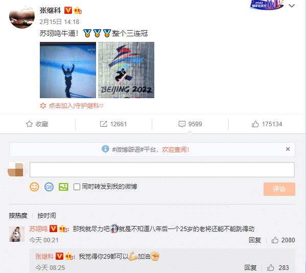 就在2月22日,苏翊鸣终于回应了,结束冬奥会征程之后的苏翊鸣有时间处理社交媒体上好友的评论了,他回复张继科:“那我就尽力吧,就是不知道八年后一个25岁的老将还能不能跳得动。”