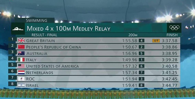 - 【录像】[腾讯] 4X100米男女混合泳接力中国队摘得银牌 英国队破世界纪录获得金牌2021-07-31 11:02:48