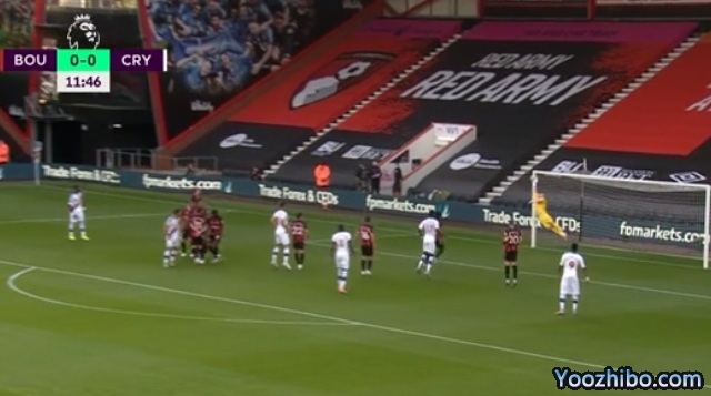 上半场:扎哈在对方半场获得一个任意球,米利沃杰维奇主罚命中,伯恩茅斯0-1水晶宫。