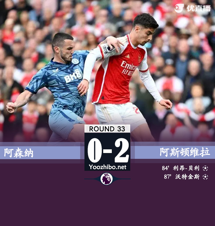 24直播网讯:北京时间4月14日,英超联赛第33轮,阿森纳主场迎战阿斯顿维拉。上半场,哈弗茨打门被马丁内斯挡出,萨卡小角度爆射击中边网,沃特金斯断球低射中柱,特罗萨德近距离打门被马丁内斯神勇化解,萨卡内切兜射稍偏;下半场,蒂勒曼斯远射击中横梁后反弹中柱,热苏斯推射被扑,迪涅横传助攻贝利后点包抄破门打破僵局,若日尼奥传球失误后沃特金斯接长传单刀挑射入网。最终比分为阿森纳0-2阿斯顿维拉。