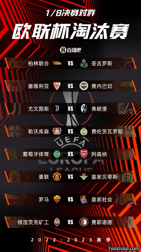 24直播网讯 2月24日讯欧联杯1/8决赛对阵抽签结束,阿森纳遭遇葡萄牙体育,曼联对阵贝蒂斯,尤文碰上弗赖堡,罗马交锋皇家社会。