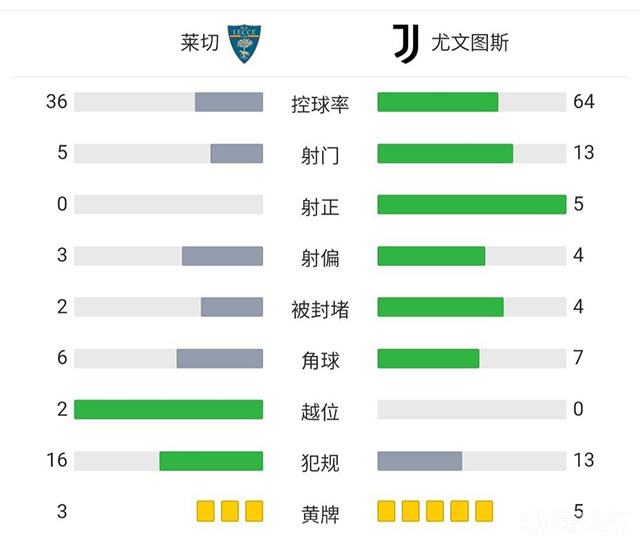 第73分钟,伊令左路横传,法乔利禁区内一脚兜射,皮球直挂网窝死角,莱切0-1尤文图斯!第88分钟,尤尔曼德禁区前沿低射击中立柱弹出,尤文逃过一劫。