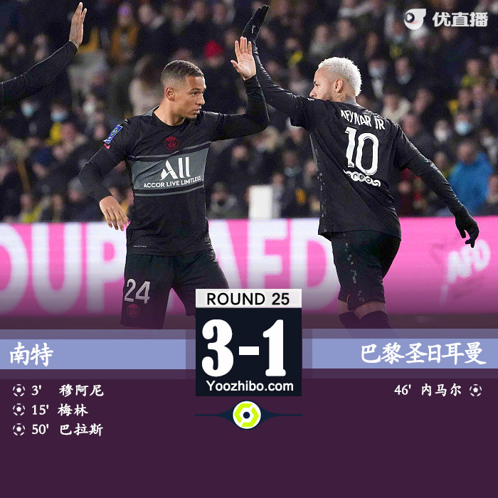 24直播网2月20日讯 北京时间2月20日凌晨04:00,法甲第25轮继续进行,巴黎圣日耳曼客场挑战南特。上半场,穆阿尼和梅林连进两球,维纳尔杜姆送点,巴拉斯主罚命中帮南特3球领先。下半场,梅西助攻内马尔破门,姆巴佩制造点球内马尔主罚被拉冯直接没收。最终,巴黎1-3客场负于南特。