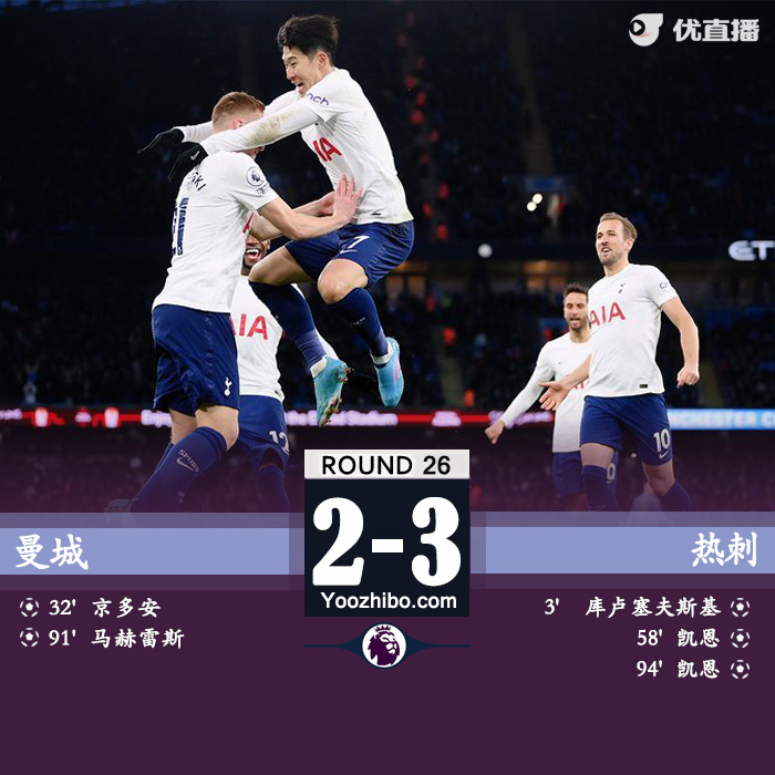 24直播网2月20日讯 北京时间2月20日凌晨1:30,2021-22赛季英超第26轮焦点赛,曼城坐镇主场迎战热刺。上半场,孙兴慜单刀助攻库卢破门,京多安补射扳平。半场战罢,曼城暂1-1热刺。下半场,孙兴慜助攻凯恩进球,凯恩破门被吹,89分钟B席造点马赫雷斯主罚命中,95分钟库卢助攻凯恩头球绝杀。全场结束,曼城2-3热刺惨遭赛季双杀。