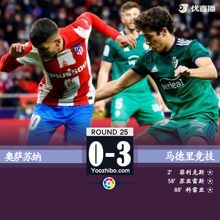 24直播网2月20日讯 北京时间2月19日23:15,西甲联赛第25轮奥萨苏纳主场迎战马竞的比赛。上半场菲利克斯开场闪击破门,下半场苏亚雷斯神仙球吊射建功,随后科雷亚替补再下一城,最终马竞客场3-0奥萨苏纳。