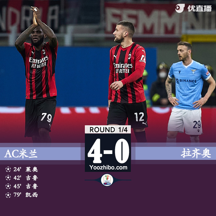24直播网2月10日讯 北京时间2月10日04:00,意大利杯1/4决赛米兰对阵拉齐奥。上半场比赛,莱奥破门,随后吉鲁完成梅开二度。半场结束,米兰3-0拉齐奥。下半场比赛,因莫比莱伤退,凯西建功。最终全场比赛结束,米兰4-0拉齐奥,晋级半决赛。