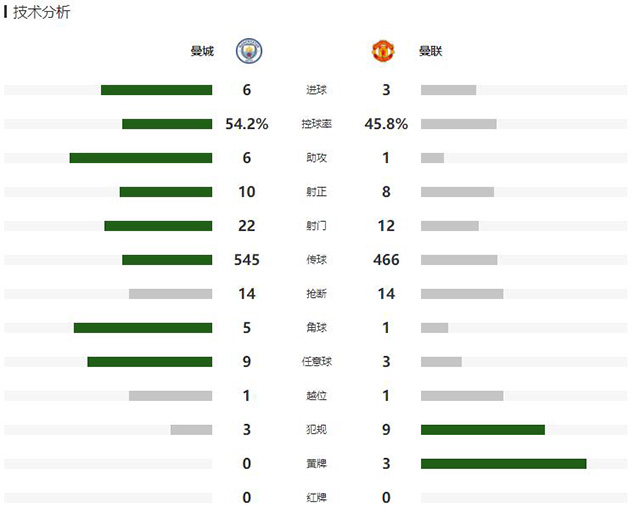 下半场伤停补时2分钟,随后全场比赛结束,曼城在主场6-3击败曼联拿下第188次曼市德比的胜利。