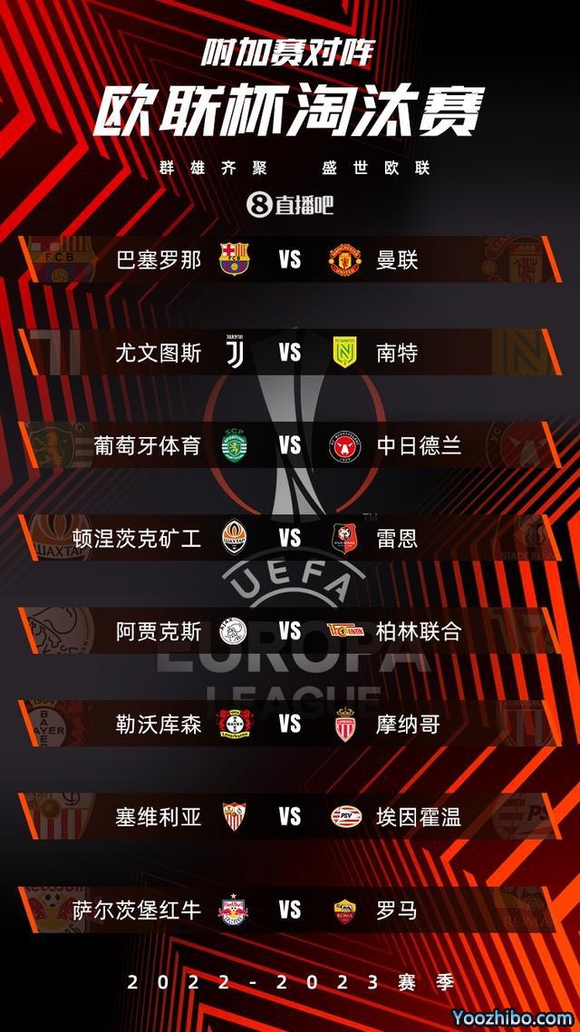 24直播网 11月7日讯 北京时间20:00,2022-2023赛季欧联杯淘汰赛附加赛抽签仪式进行,完整抽签结果出炉!巴萨遭遇曼联,上演欧冠级别对阵!!!尤文对阵南特,罗马芃萨尔茨堡红牛。