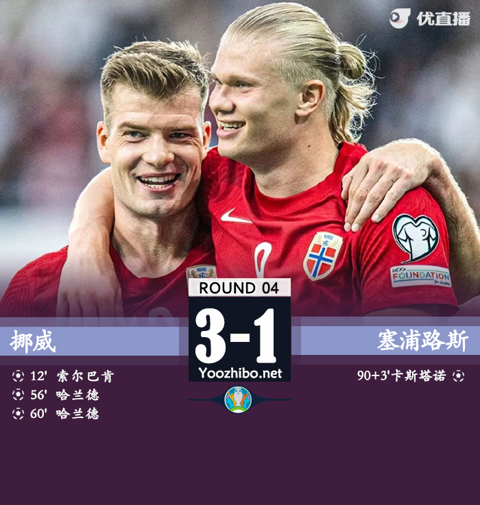 24直播网讯 北京时间6月21日凌晨2点45分,欧洲杯预选赛小组赛第4轮展开一场较量,挪威主场对阵塞浦路斯。上半场,索尔洛特传中,索尔巴肯抽射打破僵局。下半场,哈兰德点射得分。随后,厄德高助攻哈兰德再下一城。读秒阶段,卡斯坦诺斯攻入安慰性进球。全场比赛结束,挪威3-1击败塞浦路斯,拿下本届欧洲杯预选赛首场胜利。