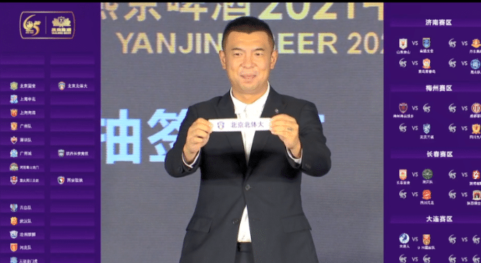 抽签仪式先确定四个赛区的安排,A赛区是济南赛区,山东泰山落位A1,B赛区是梅州赛区,梅县球乡落位B1,C赛区是长春赛区,长春亚泰落位C1,D赛区是大连赛区,大连人落位D1。A和B是上半区,C和D是下半区。紧接着抽签仪式,南通支云被抽出,山东泰山对阵南通支云。青岛青春岛落位A,6,丹东腾跃落位A7,昆山队落位A8,进入济南赛区。