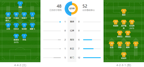 苏宁出场阵容:1-顾超;20-海米提、2-李昂、27-杨博宇、30-叶重秋(59’8-冯伯元)、24-吉翔;3-田依浓、7-罗竞(84’16-高天意(U23))、11-谢鹏飞(59’18-张凌峰(U23))、12-张晓彬(90+2’38-谢志伟(U23));32-黄紫昌