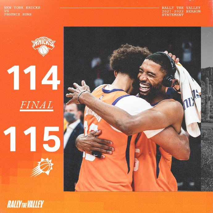 24直播网3月5日讯 NBA常规赛继续进行,高居联盟第一的太阳主场迎战尼克斯,缺少布克和保罗的太阳上场大胜开拓者终结连败,而尼克斯近来遭遇六连败位列东部倒数第四,此役一上来两队手感火热陷入僵持,兰德尔予取予求首节独得14分,布里奇斯连中三分率队逐渐占优,首节结束时太阳领先2分,次节回来,两队太阳延续外线火热手感,沙梅特和约翰逊连中三分,尼克斯多点开花继续紧咬比分,半场战罢,太阳继续领先3分。易边再战后富尼耶联手兰德尔打出7-0小高潮,尼克斯一举反超,随后双方你来我往继续僵持,兰德尔与约翰逊爆发冲突,前者累积两T被驱逐,但尼克斯多点开花扩大优势,三节结束后尼克斯反超12分,末节上来,约翰逊连进三分率队打出9-0小高潮缩小分差,约翰逊手感滚烫单节轰下21分,尼克斯内外结合总能及时回应,关键时刻克劳德飚中反超三分,罗宾逊补篮打进再度反超,约翰逊最后时刻上演压哨三分绝杀,最终太阳115-114险胜尼克斯。