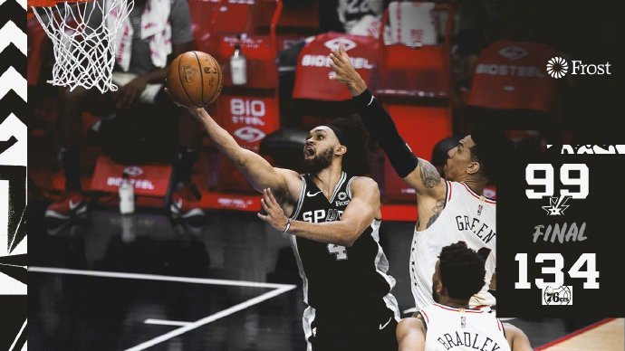 24直播网3月15日讯 NBA常规赛继续进行,76人主场迎战马刺。76人目前高居东部第一,球队也在上一场比赛中大胜奇才取得四连胜,但当家球星恩比德的受伤给胜利蒙上了一层阴影,好在恩比德此次伤病并不严重,据消息称2-3周后即可复出。马刺目前位列西部第七,阿尔德里奇已和球队达成协议不再出战,德罗赞也因个人事务缺阵。本场西蒙斯迎来复出。一开场,面对旧主的丹尼-格林毫不手软,4投全中独得11分,帮助76人领先11分结束首节。次节比赛马刺奋力反击一度把分差缩小到4分,西蒙斯连续得分帮助球队稳住局势,半场打完76人60-52领先马刺8分。易边再战,76人火力全开,马刺无力招架,波波维奇五上五下也于事无补,马刺完全被打散,76人单节拿到46分,领先33分进入末节。末节彻底沦为垃圾时间,但76人势头不减三分连续命中,最终76人主场大胜马刺,喜获五连胜。