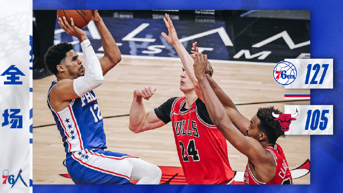 24直播网3月12日讯 NBA常规赛公牛主场对阵76人,本场比赛76人的恩比德和西蒙斯双双缺阵,开场后两队你来我往互不相让,不过76人依靠整体发挥逐渐取得领先。第二节虽然公牛一度依靠马尔卡宁、怀特和拉文三人的三分追平比分。但哈里斯带领76人稳住节奏,上半场76人64-57领先公牛。下半场回来76人仍旧占据场上主动,虽然赛迪斯-杨频频砍分也只是帮助公牛没有被拉大分差,第四节开始科克马兹和霍华德更是带领轮换阵容打出一波高潮直接锁定胜局,最终76人127-105轻松拿下公牛。